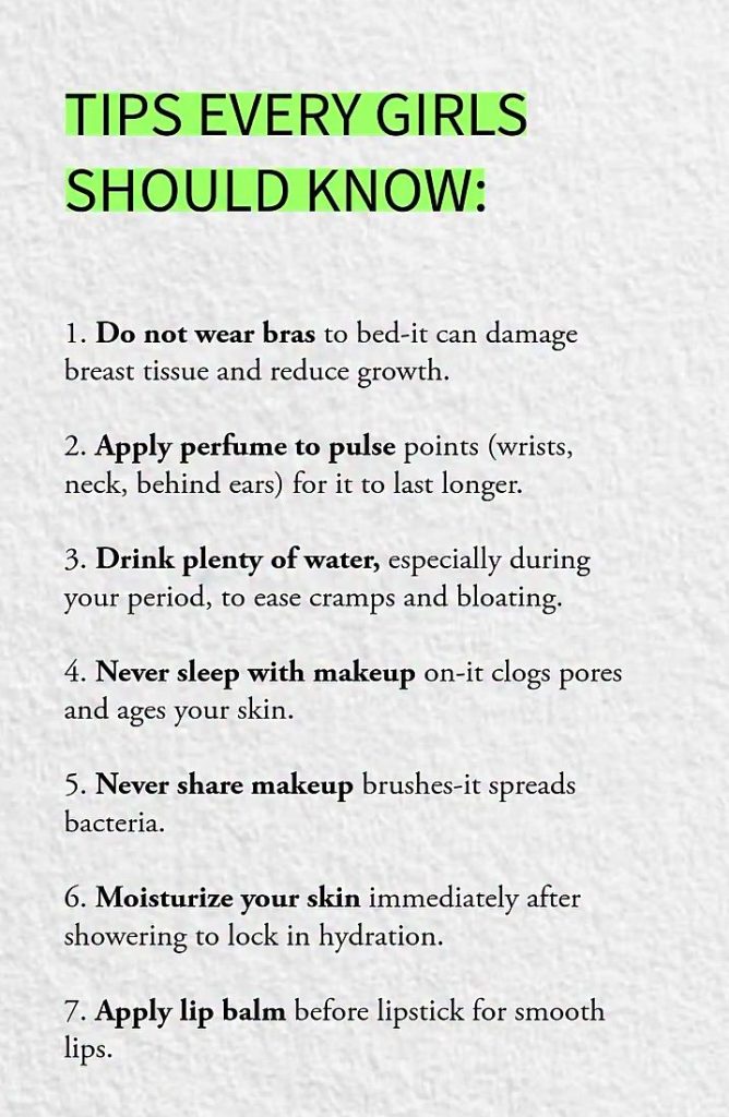 Taking care of your body and skin doesn’t have to be complicated. Here are seven essential tips every girl should know to stay healthy, fresh, and confident every day. Avoid wearing bras to bed as it may put pressure on breast tissue. Instead, focus on simple habits like drinking plenty of water to reduce cramps and bloating during your period. Applying perfume to pulse points such as wrists, neck, and behind the ears helps the scent last longer, while moisturizing right after a shower locks in hydration.